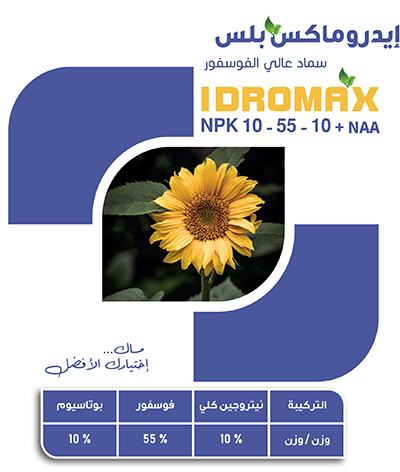 ايدروماكس 10/55/10 سماد مركب ذواب 100% في الماء , يحتوي على النيتروجين والفوسفور والبوتاسيوم في معادلة سمادية عالية التركيز في عنصر الفوسفور بالإضافة إلى العناصر الصغرى والنادرة والهرمونات الطبيعية ومحفزات انقسام الخلايا والمركبات العضوية والحيوية , هذه المعادلة تجعله مركب مناسب لجميع أنواع النباتات والمحاصيل الزراعية في مراحل الشتل والزراعة والتجذير والتزهير والعقد .