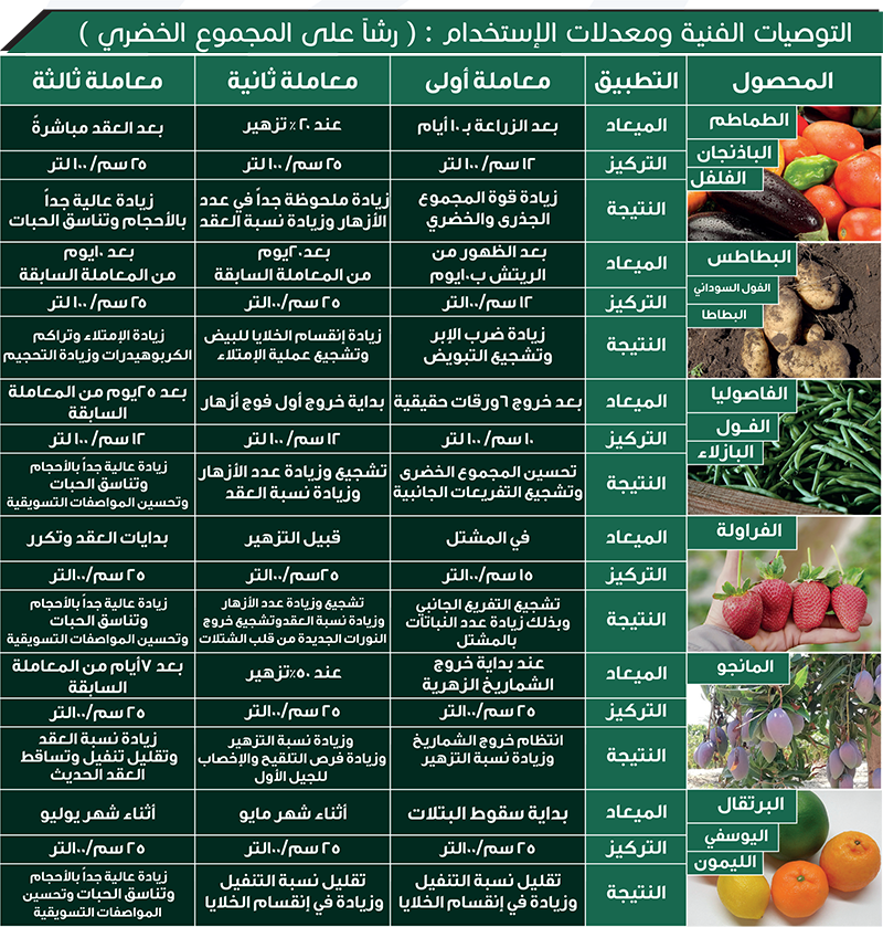 – تحسين ودفع عمليتي التزهير والعقد لجميع محاصيل الخضر وأشجار الفاكهة.