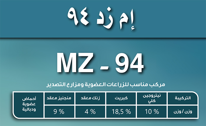 MZ 94 مركب عضوي يحتوي على الزنك المعقد والمنجنيز المعقد على أحماض عضوية بالاضافة الى النيتروجين فى صورة أمونيومية .